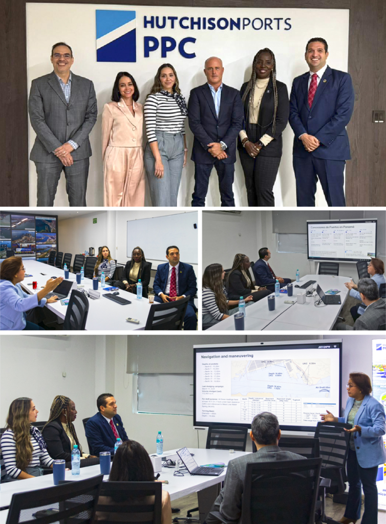 Foto superior: René Gómez (primero a la derecha), Presidente de la Cámara Marítima de Panamá; Franchesca Carrington (segunda a la derecha), Vicepresidenta; y Jared Zerbe (tercero a la derecha), Presidente Ejecutivo de Hutchison Ports PPC, junto a representantes del sector durante una visita estratégica enfocada en inversión, seguridad jurídica y el futuro del ecosistema logístico de Panamá.